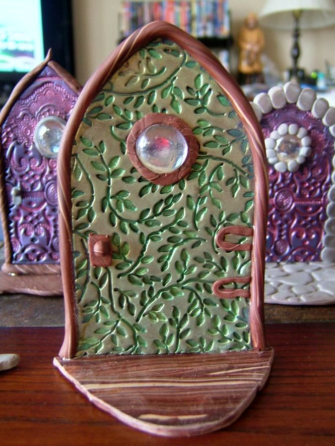 Мініатюрні казкові двері з полімерної глини, мабуть, зробити найлегше. Як правило, такі двері робляться цільною конструкцією, без можливості відкриватися та закриватися. Зате ви можете дати волю фантазії і створити чудово прикрашені двері для фей з використанням кольорового скла, намистин, мозаїки, дрібних деталей і декоративних елементів.