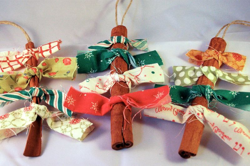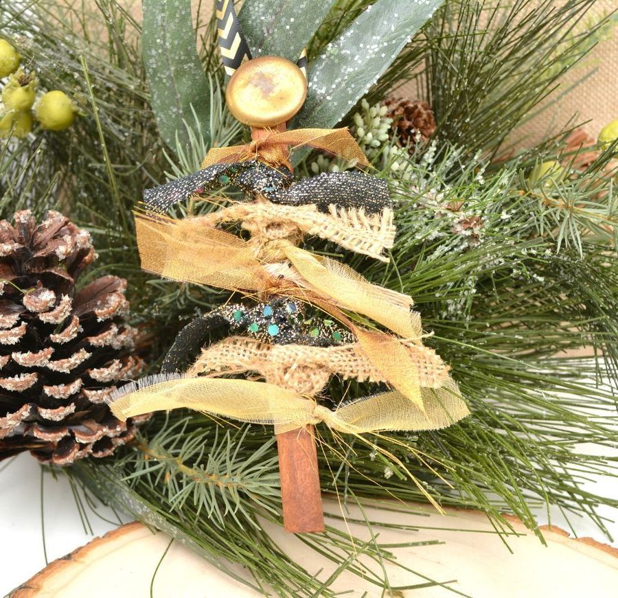 Замість стрічок можна використовувати маленькі хвойні гілочки ялинки, туї або сосни, причому штучні і натуральні. Їх можна приклеювати клеєм прямо до паличок кориці, які виступатимуть у ролі ствола дерева. Гілки можна прикрасити намистинами, маленькими гудзиками, бантиками зі стрічок.